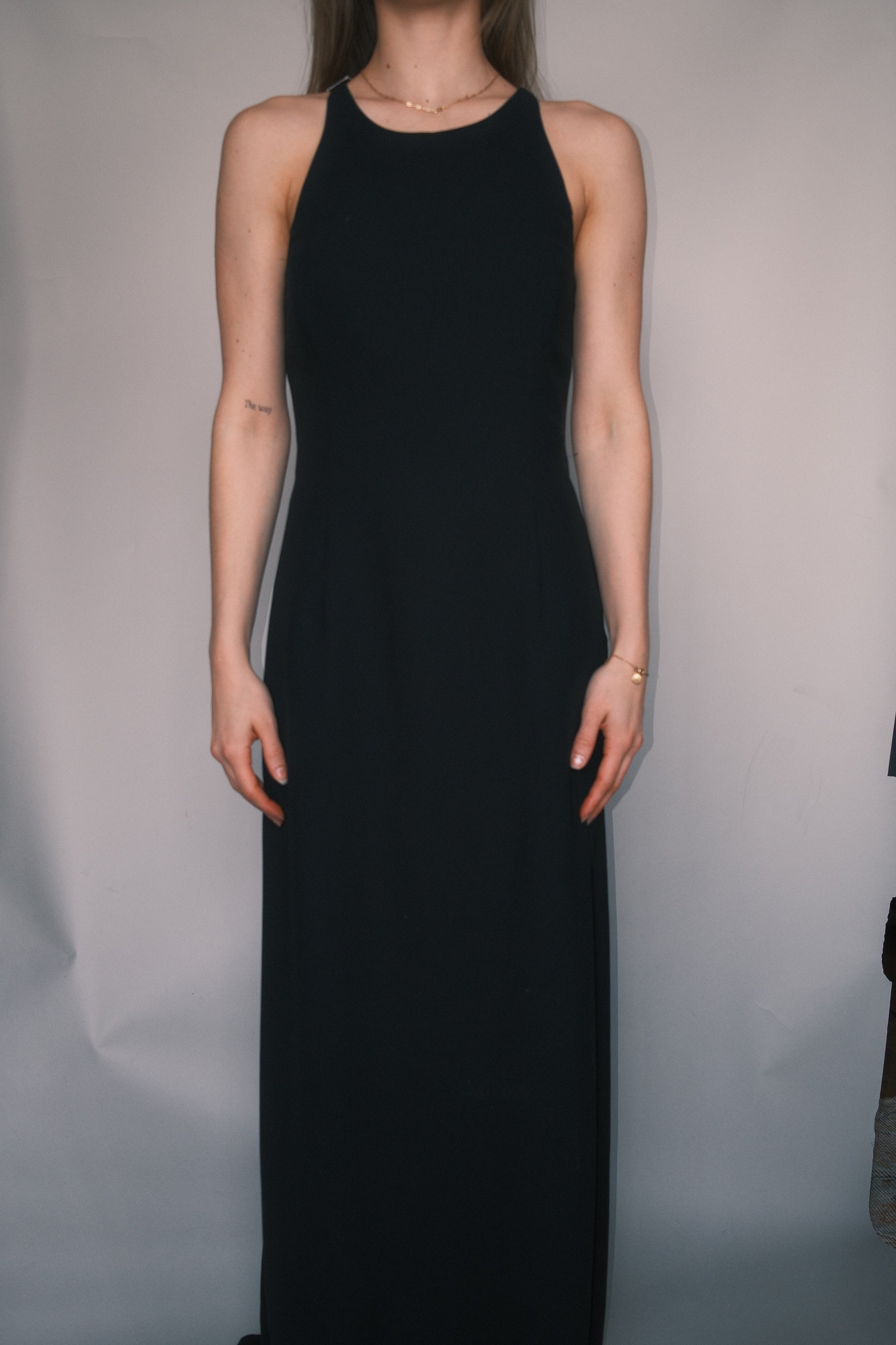 Black halter neck, open back maxi dress, metallic clasps with diamonds