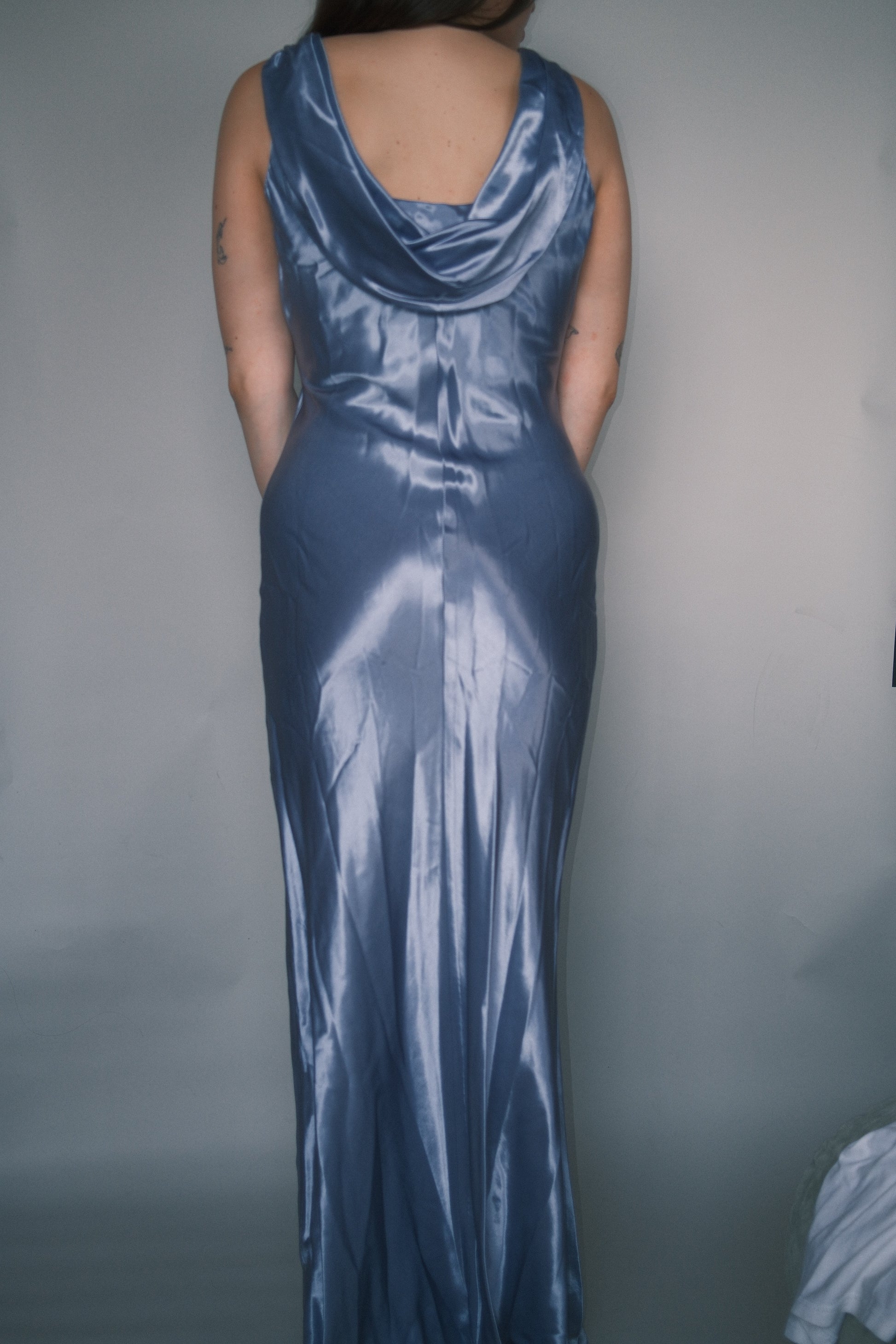 Vintage Blue Satin, Cowel back detailing maxi dress, no zipper