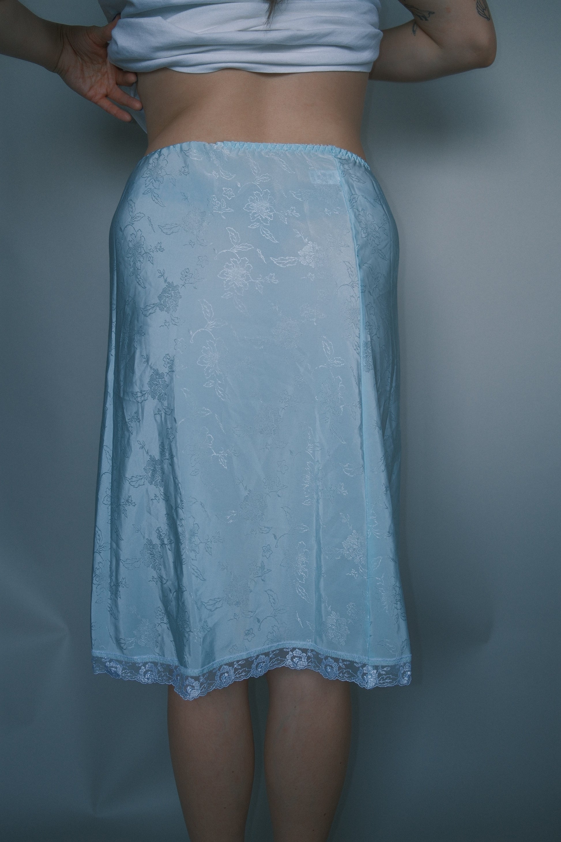 Vintage light blue slip with silver floral and lace detailing midi length, elastic waist band