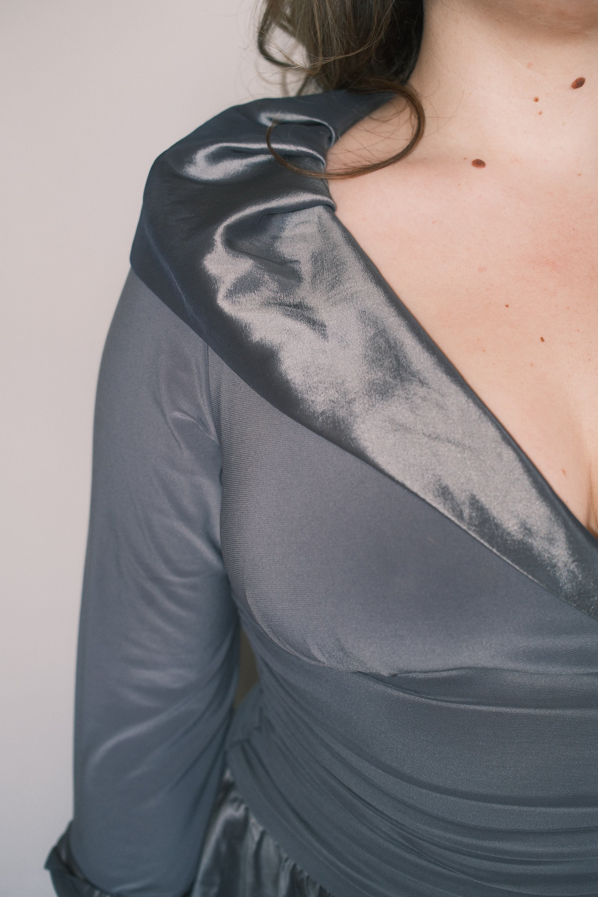 Vintage silver midi dress, stretchy grey top with metallic satin skirt and collar
